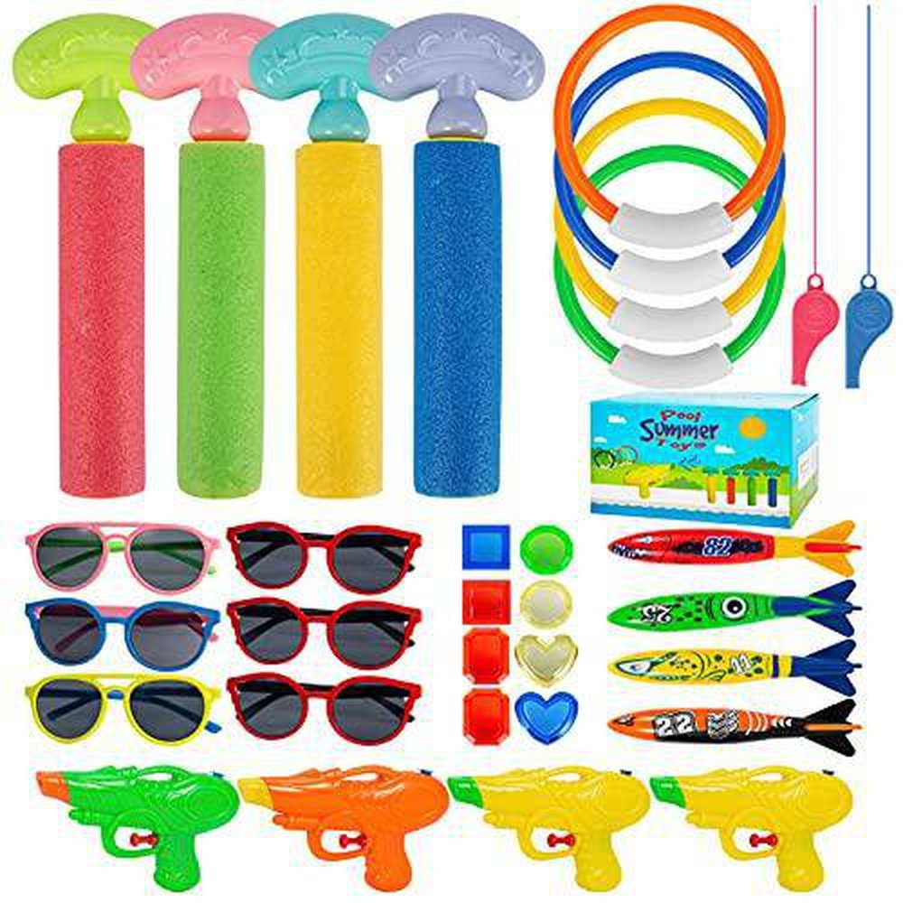 Diving Pool Toys with Water Guns Sunglasses,32Pcs Underwater Swimming Toys Pool Party Favors with Blaster Soaker Guns ,Water Ring,Whistle,Torpedo Bandits,Diving Gem for Kids Girls Boys in Summer Beach