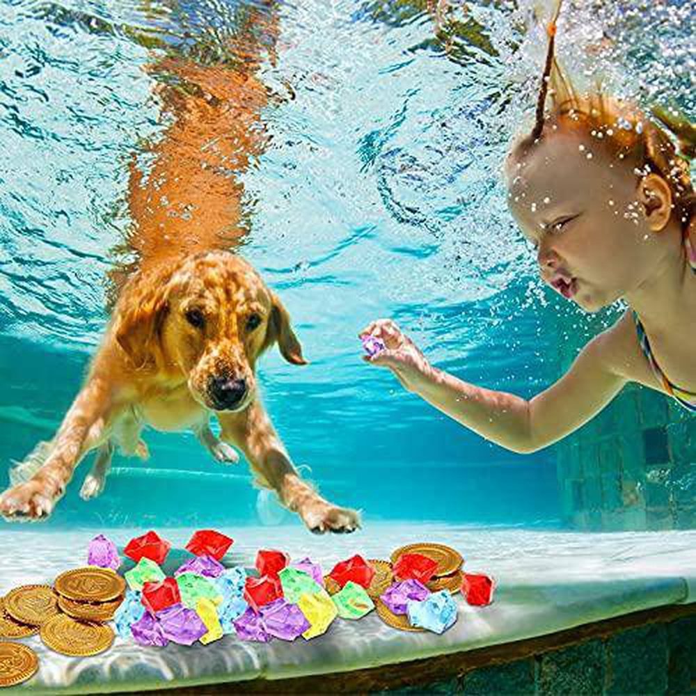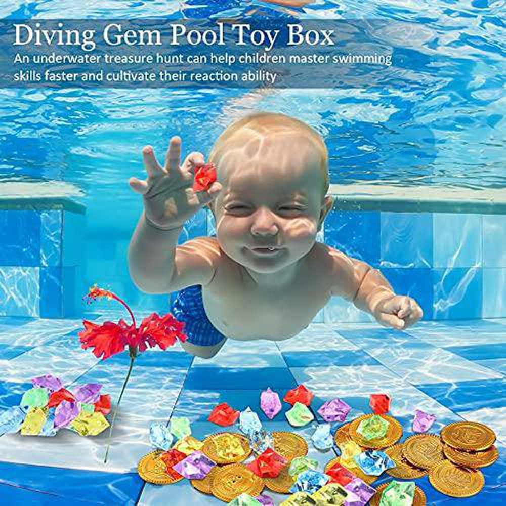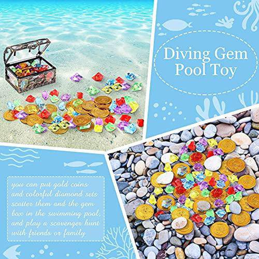 Details: Features: Exquisite appearance: These diving gems are colorful, which is easy to attract people's attention when playing games in the diving pool, put these diving toys diamonds in a pirate box and you and your friends can start a treasure hunt. Wide range of occasions: Diving gem pool toys and gold coins are suitable for decoration in various places such as summer parties, pool parties, beach parties, birthday parties, and diving toy school activities, as well as vase filling, table scatters and wedding site decoration, etc. Specifications: Color: as the picture shown Size: as the picture shown Material: plastic, resin Package includes: 2 x Pirate treasure chest toy boxes 40 x Gem dive toys 60 x Gold coins Warm notes: Please allow slight deviation due to manual measurement. Please allow slight color difference due to different monitors.