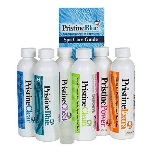 Details: The PristineBlue Spa Kit contains 6 of the components of the PristineBlue system. Contains: One 8 ounce container of PristineBlue, one 8 ounce container of PristineCheck, one 8 ounce container of PristineClean, one 8 ounce container of PristineClear, one 8 ounce container of PristineExtra, one 10 ounce container of PristinePower, one Spa measuring cup.