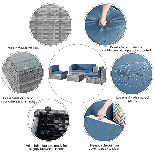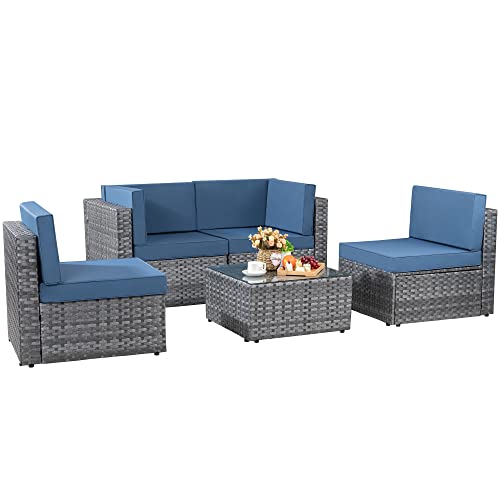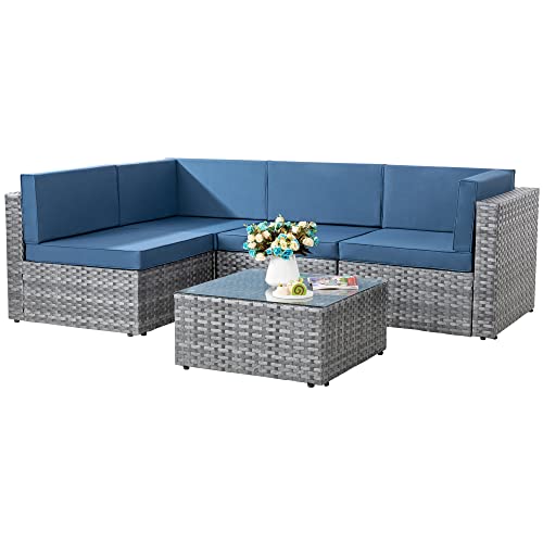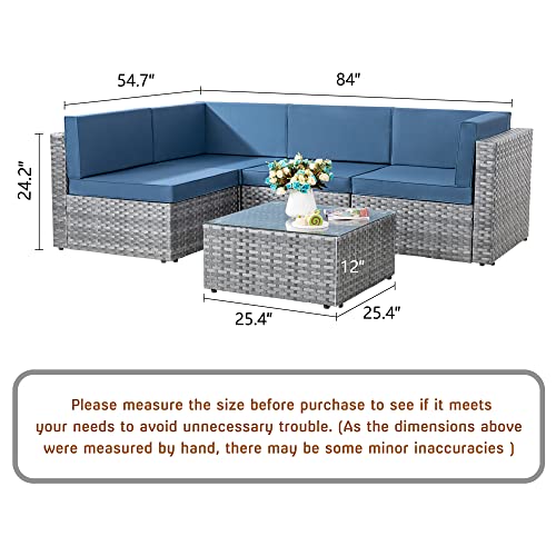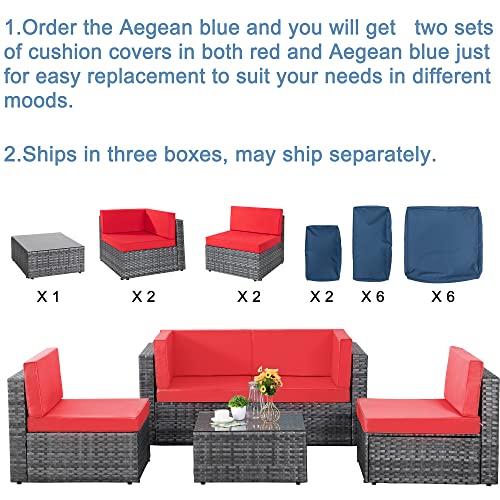 Details: We love spending time outdoors and are passionate about the outdoors, just as you are. Decorate your favorite yard look with a Shintenchi 5 piece set. Each part of the furniture is independent and can be rearranged randomly to provide a most comfortable and relaxing leisure environment for your family and friends. Feature: 1.You could combine the Shintenchi 5 pcs outdoor furniture set freely according to your needs in your garden, balcony, poolside or porch. 2. We have a variety of cushion colors for your choice. 3. Durable PE rattan material and hand woven, keep the sofa more stable. Specification: Rattan Color: Silver Gray Cushion Color: Blue/Red/Khaki/Royal Blue/Aegean Blue Steel frame material: Iron Rattan material: PE Cushion fabric: 250g polyester fabric and sponge padded Corner sofa dimensions: 29.3 x 29.3 x 24.2 inches Single sofa dimensions: 25.4 x 29.3 x 24.2 inches The dimension of side table: 25.4 x 25.4 x 12 inches 2 x corner sofa with red cover 2 x single sofa with red cover 1 x Aegean blue cushion covers set 1 x side tea table with glass top Notes: 1. Order the Aegean blue and you will get two sets of cushion covers in both red and Aegean blue just for easy replacement to suit your needs in different moods. Ships in three boxes, may ship separately. 2. Do not completely tighten the screws before you finish all the installation. 3. Please measure the size before purchase to see if it meets your needs to avoid unnecessary trouble. (As the dimensions above were measured by hand, there may be some minor inaccuracies ) 4. The color of the cushion may vary slightly in different situation or display. 5. Please cover the set when rain, snow or frost comes since the inner sponge is not water proof.