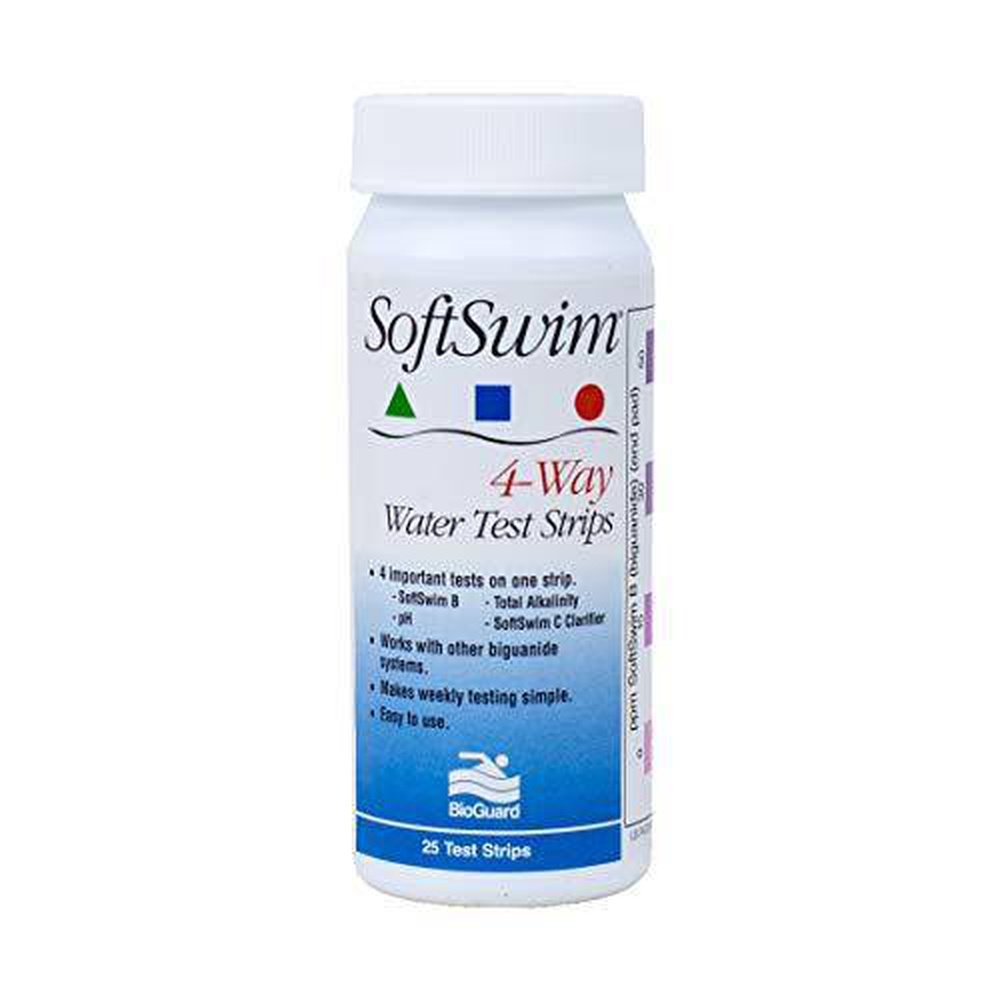 Details: BioGuard Soft Swim Test Strips are designed to test pool water for the chemicals used in the Soft Swim program. These strips are easy to use and reveal results quickly and accurately. Pool experts recommend that Soft Swim Test Strips should be used weekly to ensure properly balanced water. This product works only with pools on the Soft Swim program. Each Soft Swim product is formulated to work specifically with the biguanide chemistry of the Soft Swim program. Directions Dip Strip into water for 1 second, remove. Hold strip level for 30 seconds. Compare total alkalinity, pH, and SoftSwim C (in that order) to the color chart. Re-Dip the strip and rapidly move strip back and forth underwater for 30 seconds. Compare bioguanide part to color chart.